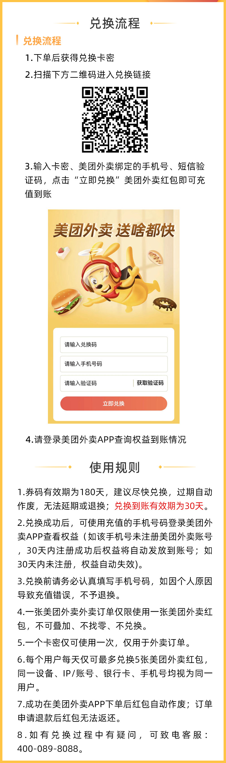 | 门店限用说明 | 1.兑换成功后,可使用充值的手机号码登录美团外卖APP查看权益(如该手机号未注册美团外卖账号,30天内注册成功后权益将自动发放到账号;如30天内未注册,权益自动失。 |